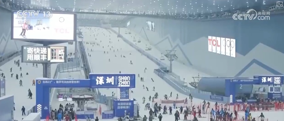 这里是深圳前海一家冰雪世界滑雪场的入口处。只需要穿过两道自动闸门,短短几米的距离,温度一下子就从室外22℃直接骤降到零下6℃,一秒从北方穿越到南方。这里有5条经认证的专业雪道,最长的一条有463米长,高度差达到83米。雪道上,既有初学的娃娃学员,也有高级道上飞驰而下的专业选手。