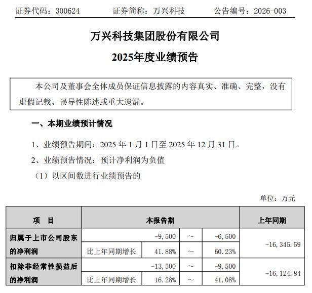 1月30日晚,AIGC软件A股上市公司万兴科技(300624.SZ)发布2025年度业绩预告。公司预计2025年归属于上市公司股东的净利润同比增长41.88%-60.23%,扣非净利同比增长16.28%-41.08%,业绩总体改善明显。